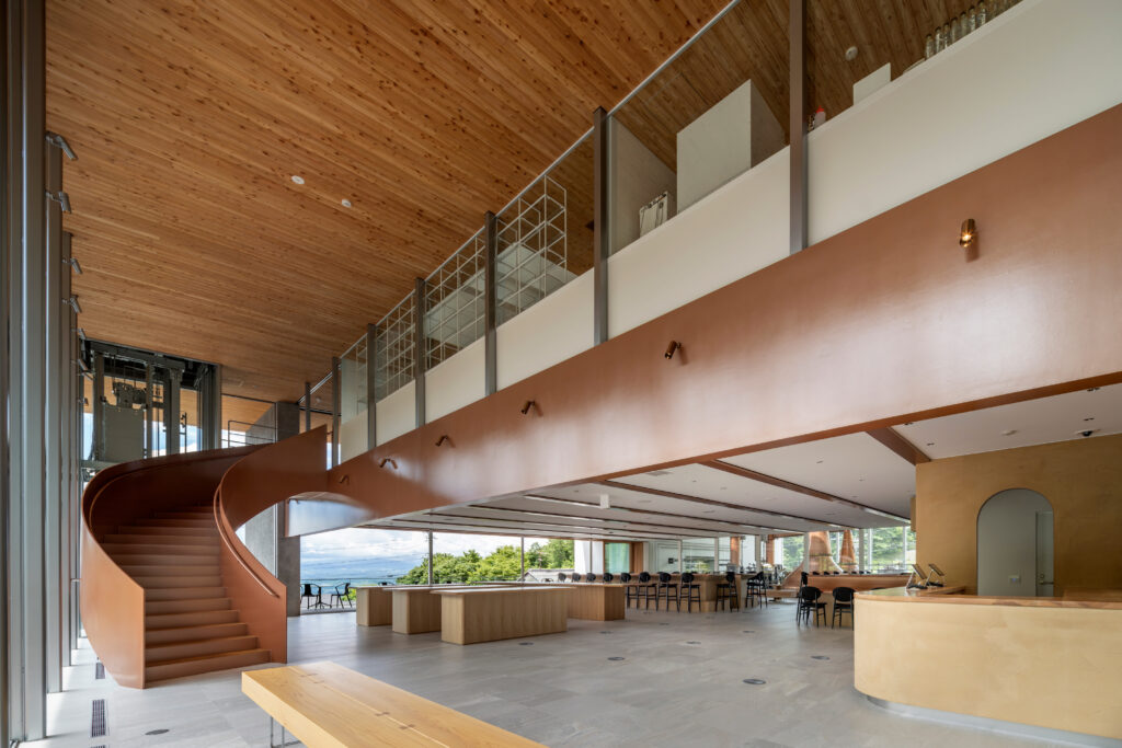 ビジターセンターの内部は2層吹き抜けのエントランスホールと飲食・物販の空間であり、お酒を飲みながら蒸留室を見ることができるような配置にしています。