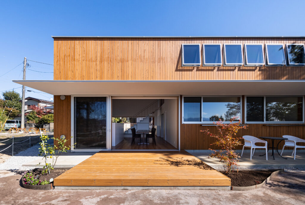 丘の上のグループホームは木と鉄のハイブリッド構造の深い庇が建物内部の共用スペースと外部空間を一体化させています。広い土間があり、ベンチを置いています。靴を履いたままコミュニケーションができるようにしています。